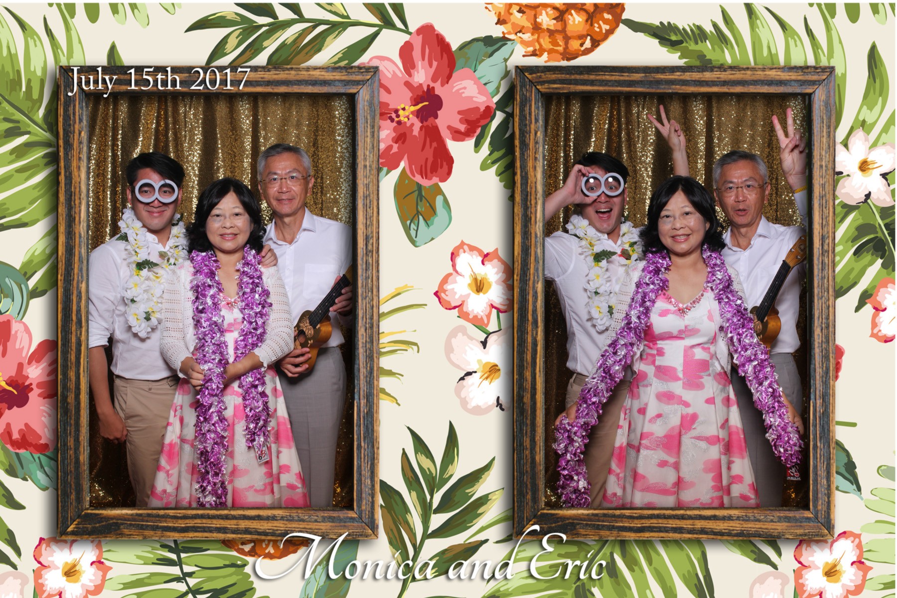 On July 15th 2017, Monica and Eric celebrated their wedding reception at the Ritz Carlton Kapalua, and decided on one of our new tropical hip templates and our gold sequins backdrop.